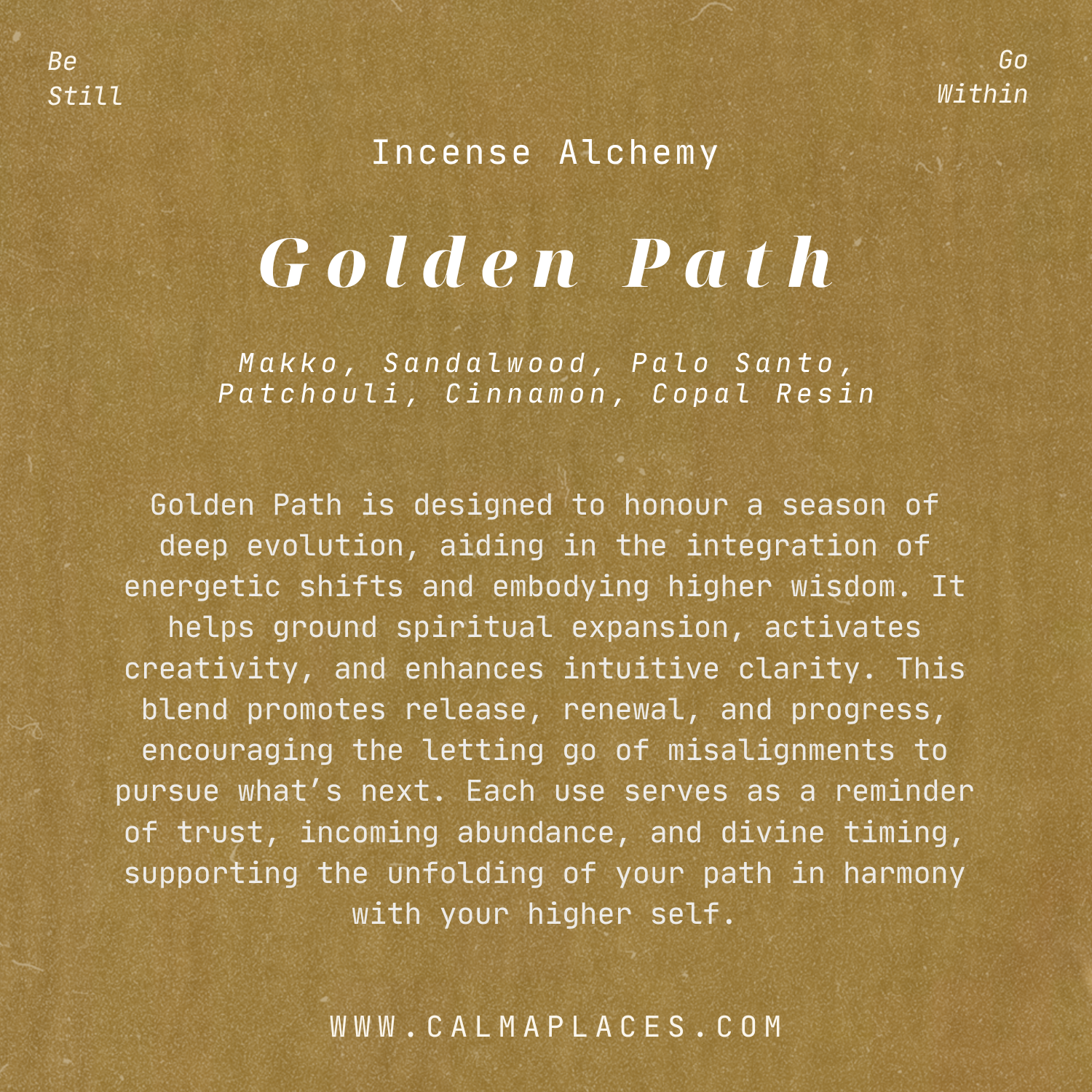 Golden Path is a warm, uplifting blend created to support seasons of inner growth and transition. It steadies the body while opening the mind to clarity, insight, and creative flow. Light it when you want to move forward with confidence, trust timing, and reconnect with your higher direction.