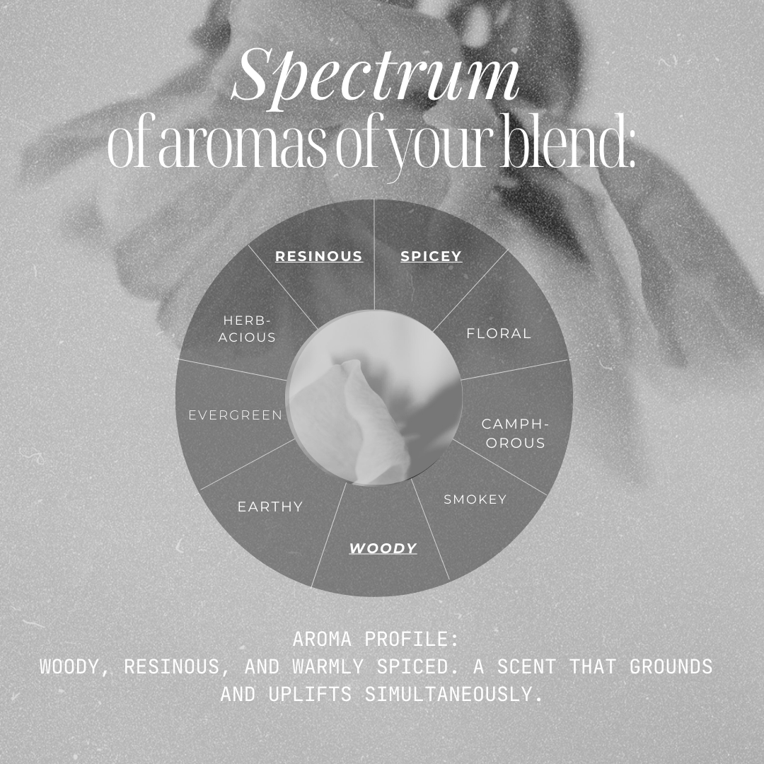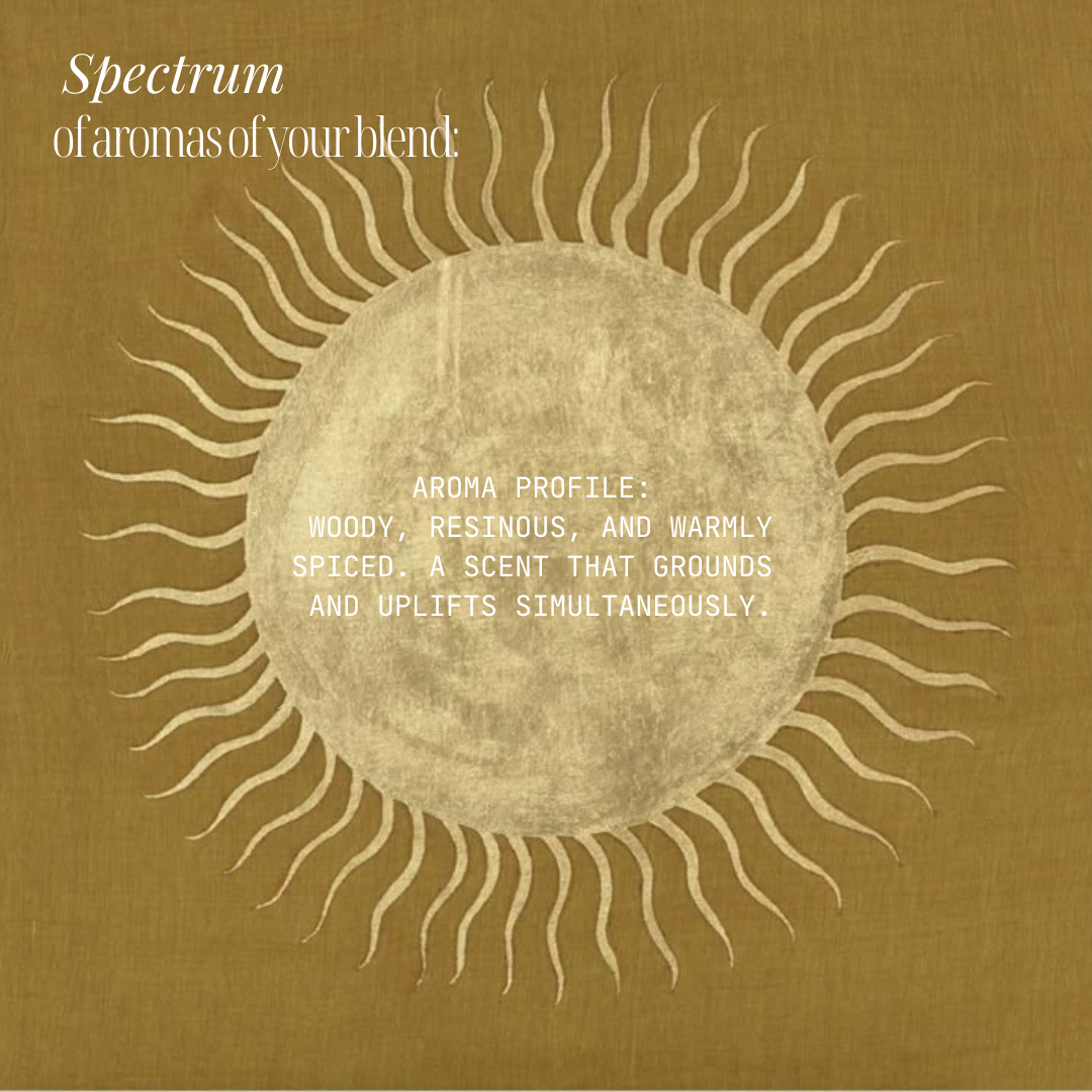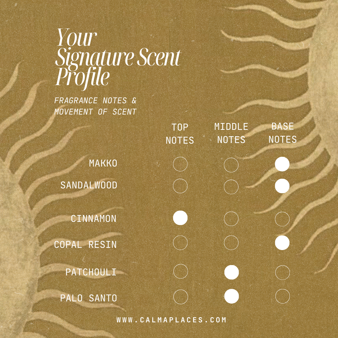 Woody, resinous, and warmly spiced. The scent opens with a soft brightness from palo santo and cinnamon, settles into grounding notes of sandalwood and patchouli, and closes with the clean, ascending quality of copal. The overall feeling is steady, warm, and expansive.