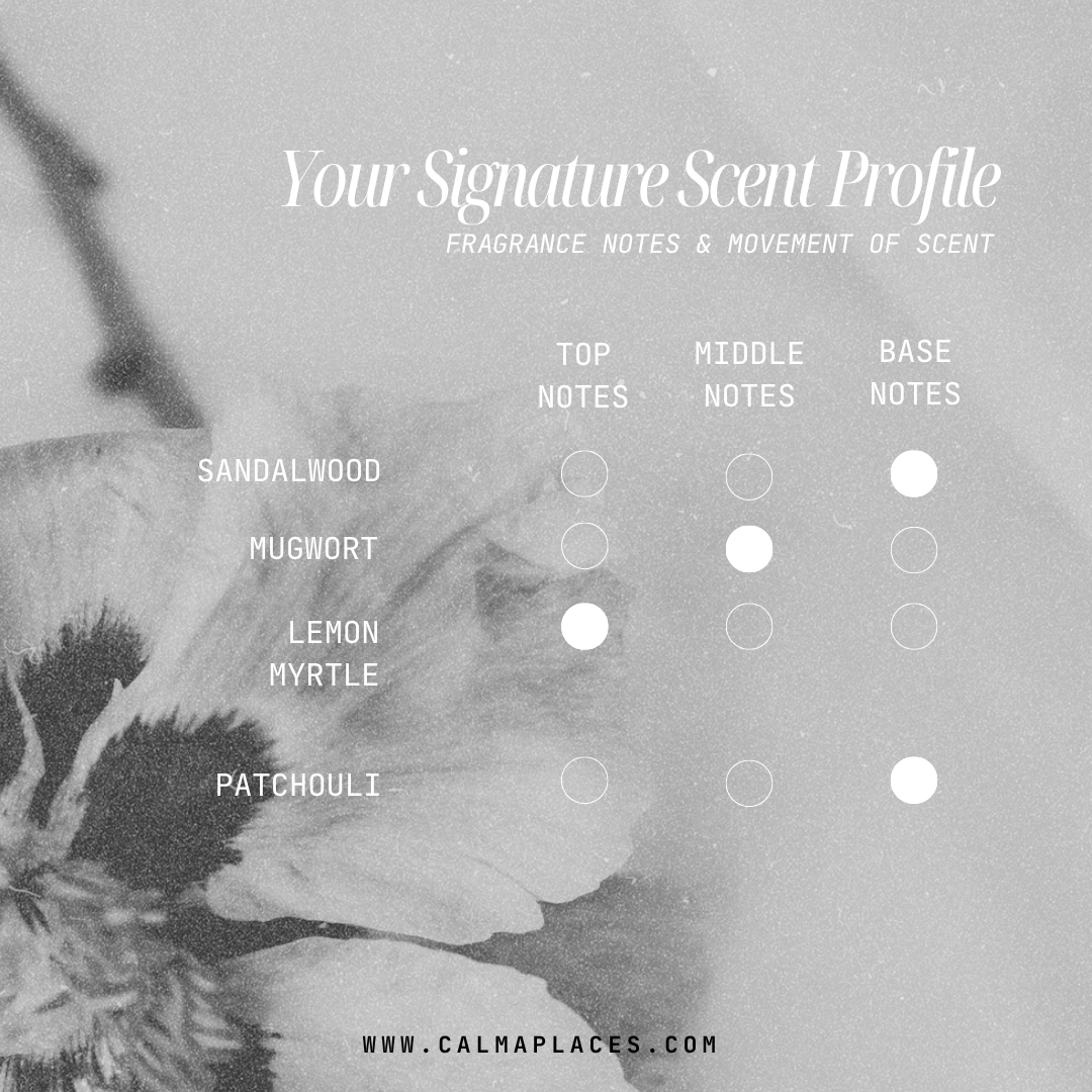 Earthy wood, soft herb, gentle citrus. The scent opens with bright notes from lemon myrtle, moves into grounding patchouli and mugwort, and settles into a warm sandalwood base. The overall feeling is centred, clear, and spacious.