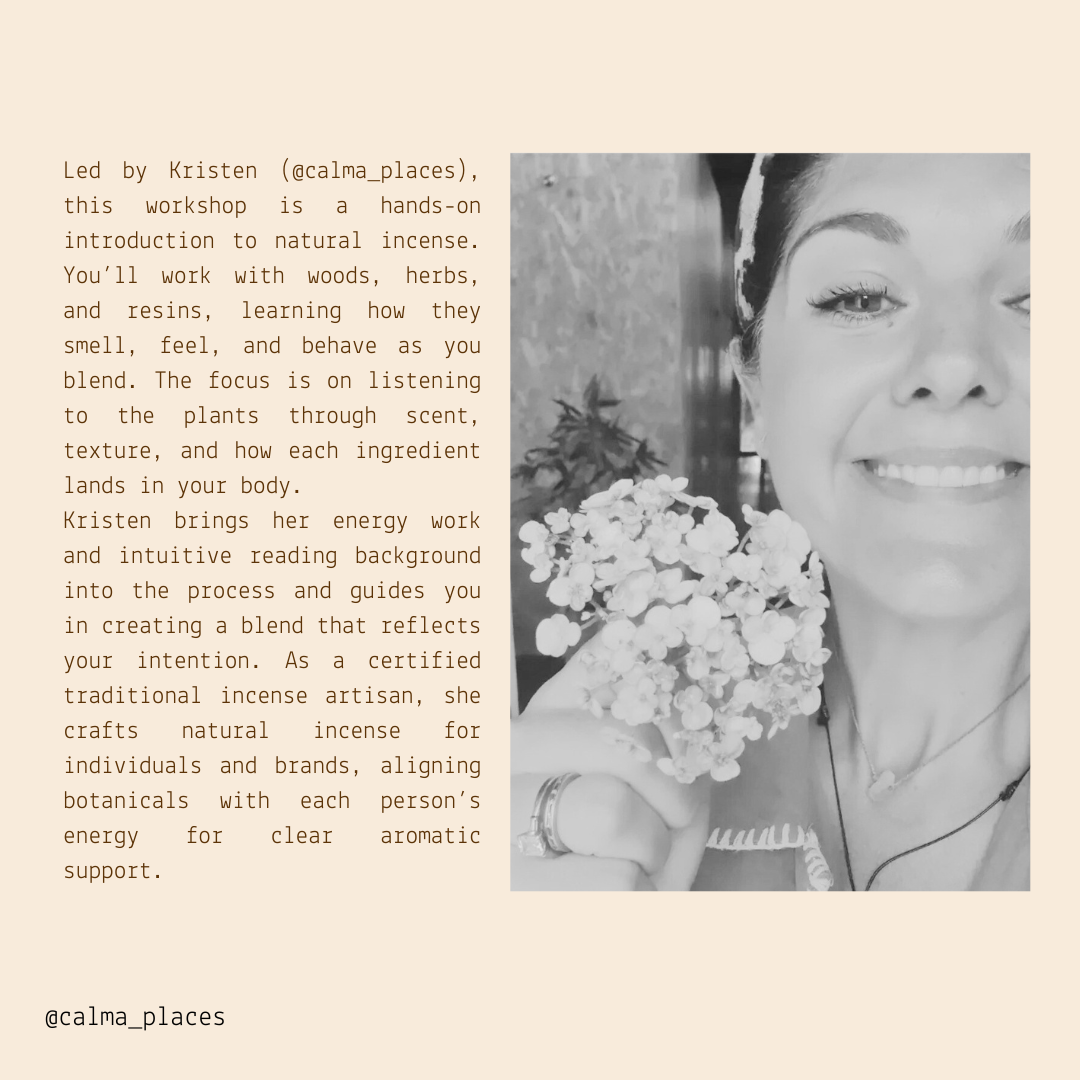 Kristen guides your group through the process of crafting natural incense using real woods, herbs, and resins. Each person creates a personalised blend guided by intention and sensory awareness, with space to move at a relaxed, grounded pace.