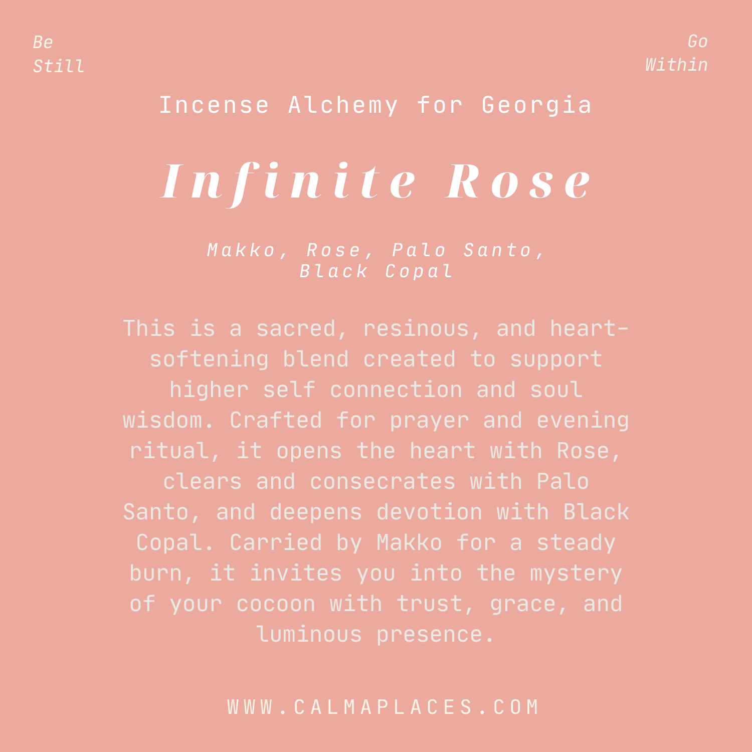 Infinite Rose is a soft and expansive incense crafted to open the heart, settle the nervous system, and create a field of quiet emotional clarity. This blend holds the feeling of warmth returning to the body. It invites presence, tenderness, and a sense of gentle inner renewal. Light it when you want to drop into yourself and breathe again.