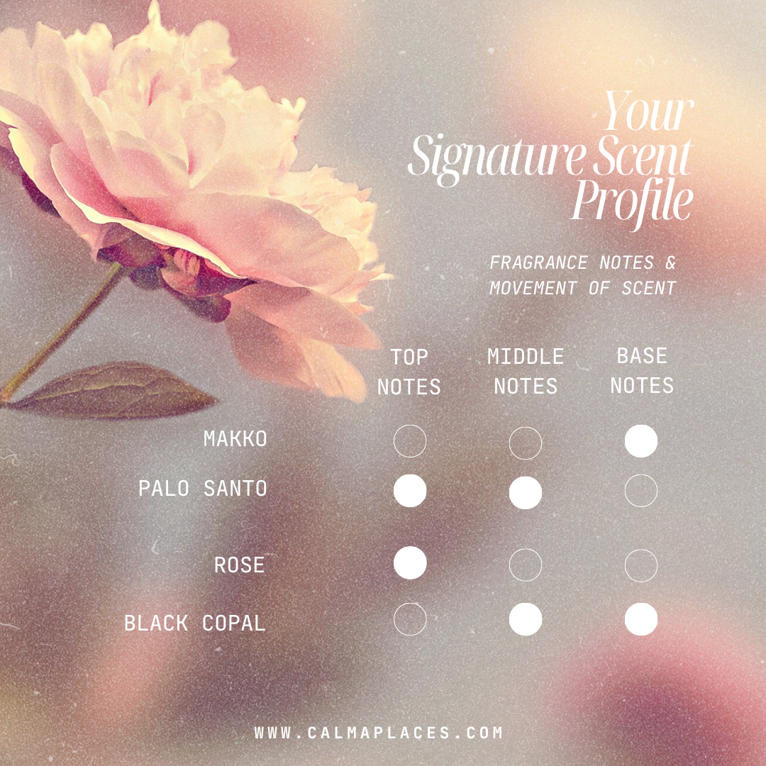 Soft floral heart notes from rose rise first, followed by warm wood and a gentle sweetness from sandalwood. Frankincense creates a clear, clean resin trail, and vetiver settles everything into a grounded earthy base. The overall scent is tender, warm, and steady.