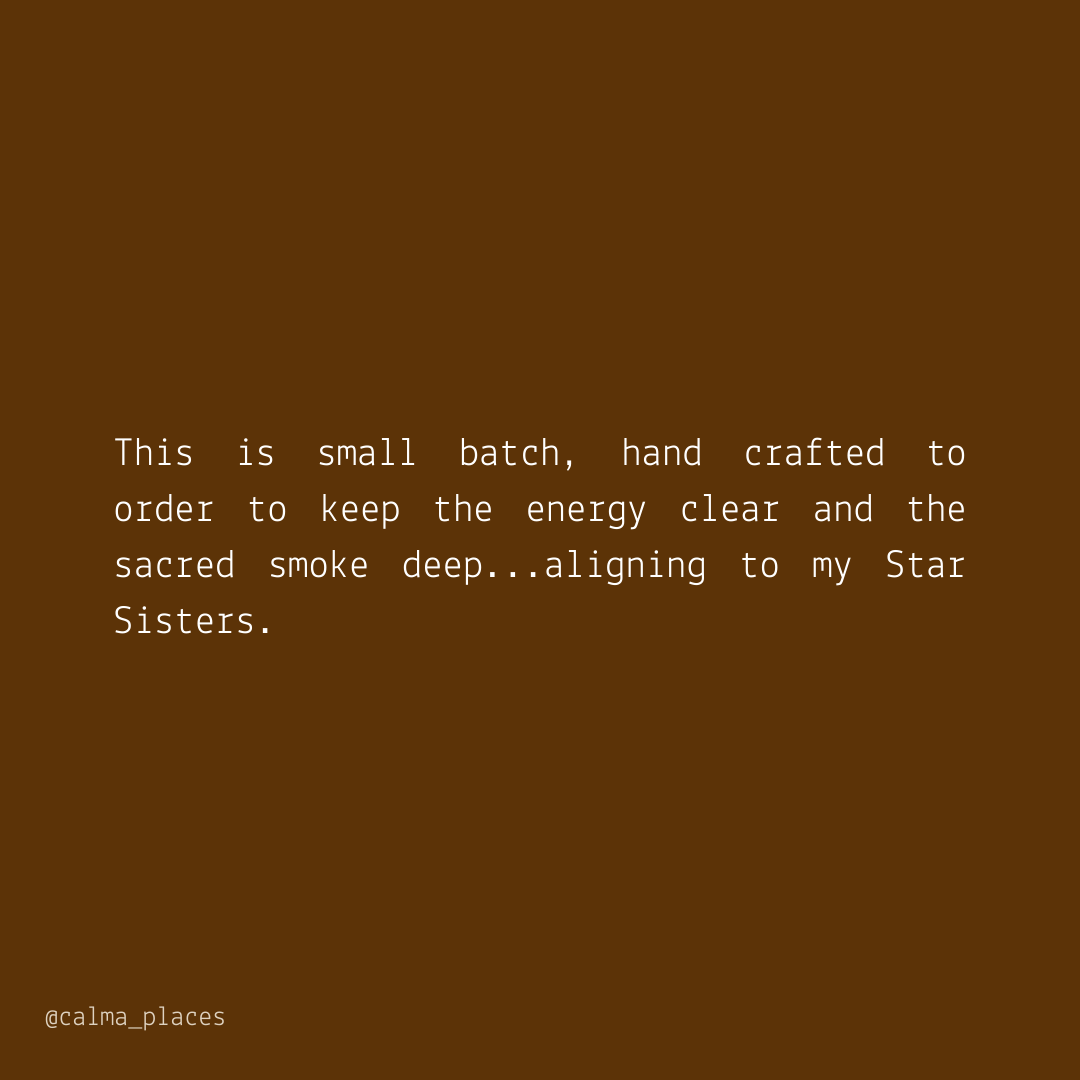 This is a small batch 16 cones, hand crafted to order, to keep the energy clean and the sacred smoke true. It is created in resonance with my Star Sisters.