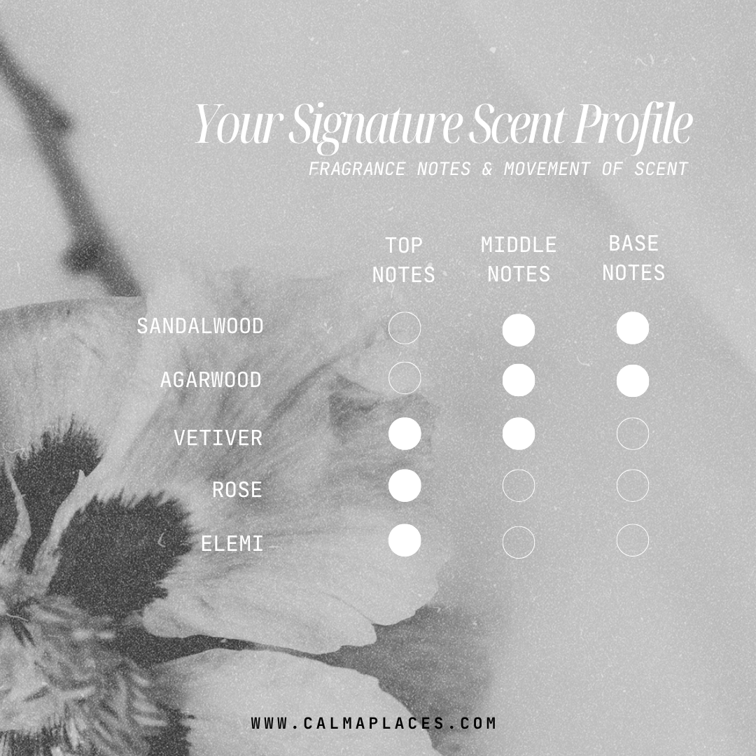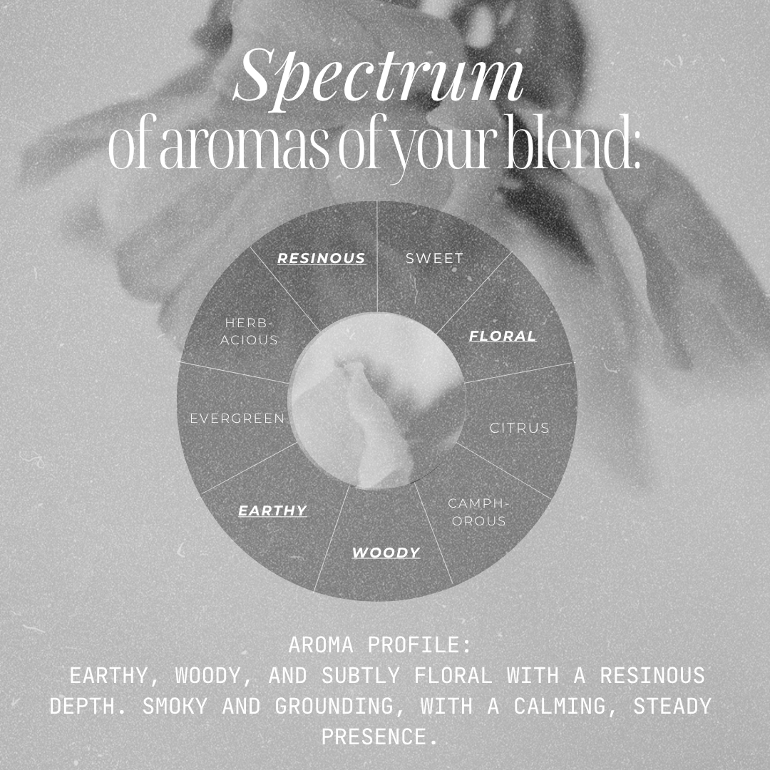 Earthy and steady with soft floral and warm resin undertones. The scent opens with clarity from elemi, moves into gentle rose and sandalwood, and sinks into a deep grounding base of vetiver and agarwood. The overall feeling is centred and spacious.