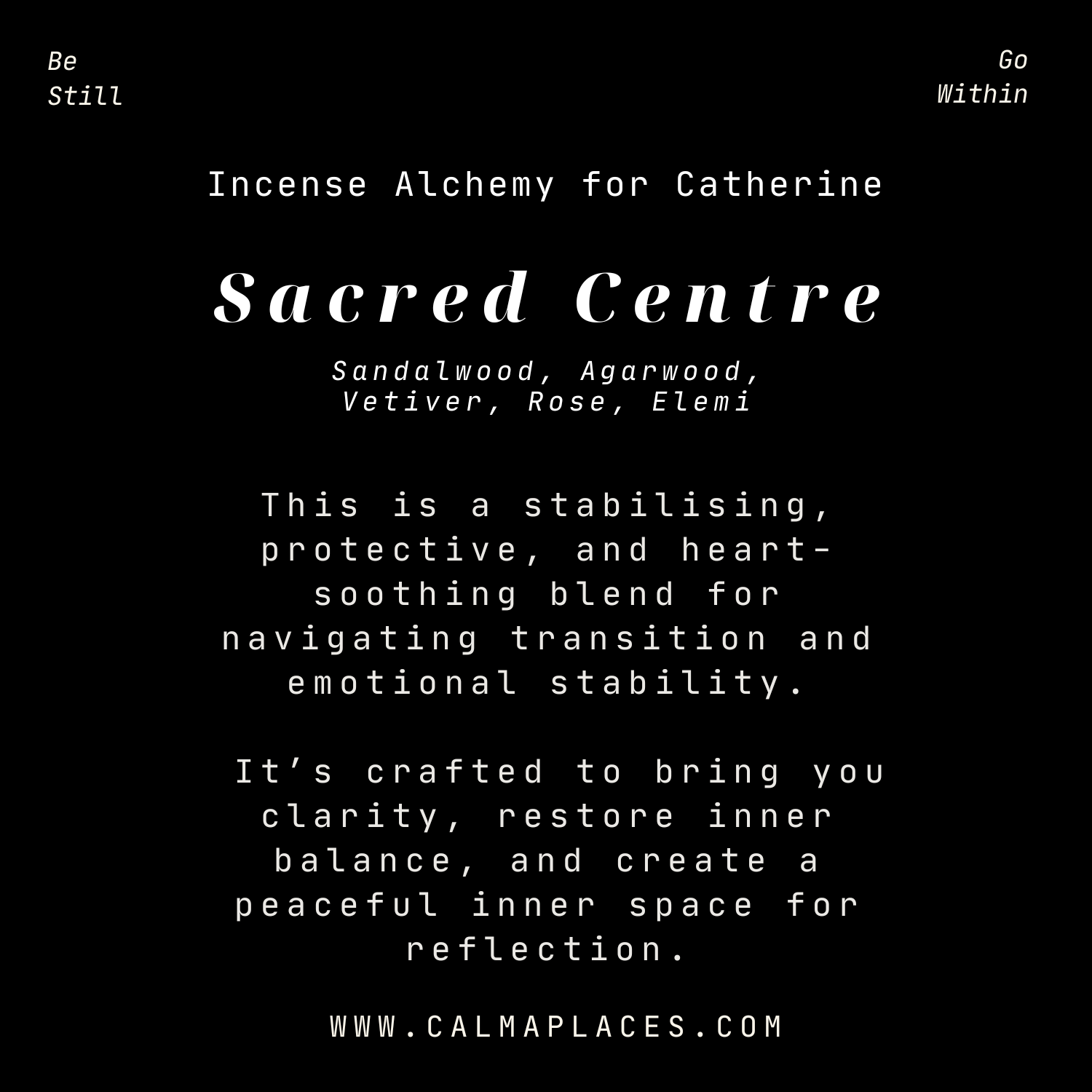 Sacred Centre is a quieting and stabilising blend created to help you come back into yourself when life feels full or uncertain. It creates a calm field around you, steadies your breath, and supports a return to clarity. Light it when you want to reconnect with your inner anchor and move from a more centred place.